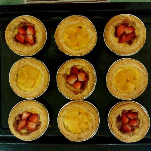 再加入蛋黄和低面搅拌,水果丁放入蛋挞皮中