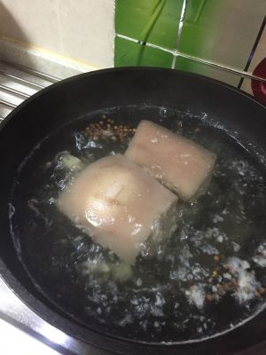 五花肉焯水,撇去浮沫,加几粒花椒煮15分钟(去肉腥)