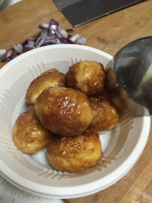 出锅后放入炒锅再收收汁(这样做肉油都压出来了,且肉软烂,适合老人和小孩吃)虎皮蛋切两半摆盘。