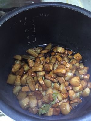 肉捞出沥干,切块,大小随自己喜欢,炒锅放油下冰糖炒糖色,将肉放入翻炒,加生抽老抽黄酒,炒香,放香叶大料炒一下,全部倒入高压锅压10分钟。