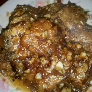 半勺老抽,两勺糖,四勺醋,几滴香油,少量温水(主要把糖化开),少量生粉(糖汁收的快),拍的时候还没加生粉香油… 调好汤汁备用