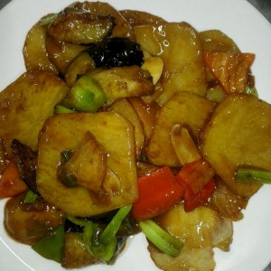 汤汁烧开后加入炸好的土豆和茄子,青红椒片翻炒均匀水生粉勾芡淋少许油即可装盘。