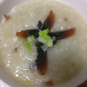 出锅时,将另一个皮蛋放入,再撒上葱花,点一点香油。