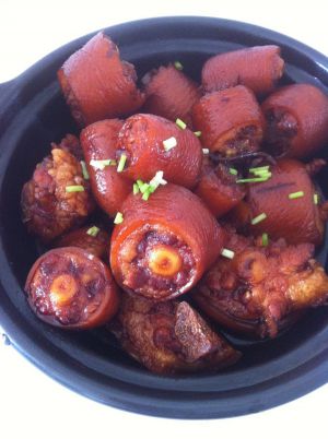 热锅放油(油少点),油热放猪尾巴翻炒几下,加老抽(你可以先少加点,颜色不红在适量添加)上色加一勺糖,加一勺生抽增加鲜味,在加猪尾巴汤(大半碗),煮到汤汁浓稠加鸡精出锅。