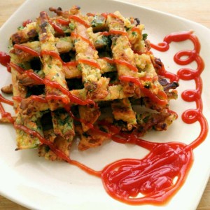 将煎好的饼 切成条摆盘 淋上番茄沙司