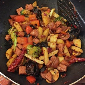然后先下入耐炒的食材,比如肉类木耳土豆等等,翻炒一段时间再下入蔬菜类等其他食材,然后你就拼命大火翻炒吧