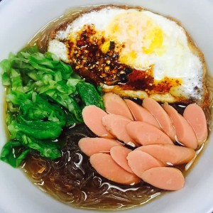 煮好粉丝(没有红薯粉就用的粉丝),装进放好调料的碗里,将鸡蛋蔬菜火腿肠码在粉丝上,浇上油泼辣子就可以啦~可根据个人喜好和材料充足的情况下加花生米榨菜肉末和其他蔬菜