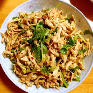 拿一个大碗,放入撕好的鸡肉,放入配料表里的配料,拌匀即可。(如果觉得干,可以加点刚才煮鸡的汤)