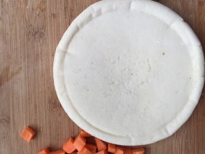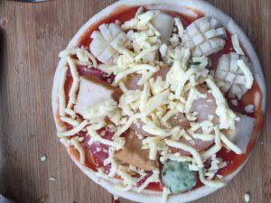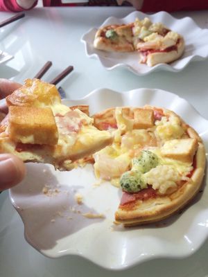 铺一层番茄酱,一层培根,把刚才炒的依次放上去,最后铺一层马苏里拉奶酪,放入烤箱上下火200度,10分钟。