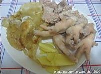 花胶发好,猪骨和鸡脚分别淖去血水.