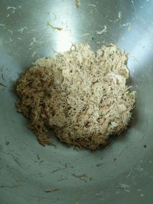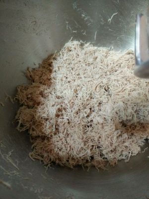 用厨师机搅拌功能把肉打松散(用和面的双刀),用面包机也可以搅拌肉松散。没有厨师机就用双手慢慢把肉撕成一丝丝的吧。