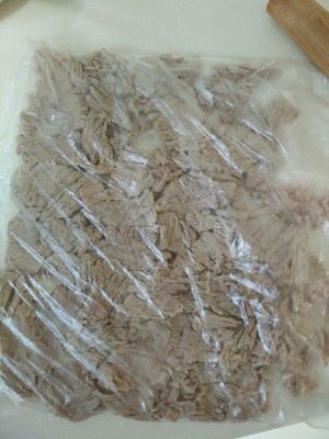 煮好的肉捞出来控干,放在保鲜袋里用擀面杖敲打松散。