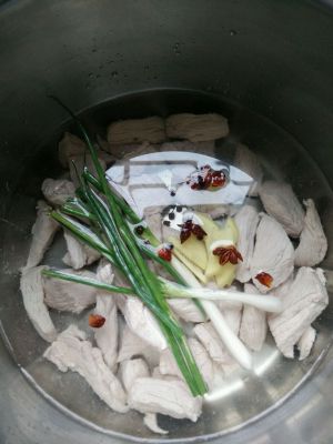 把猪肉在开水里烫一下,用漏勺盛出,用水冲洗干净,重新放水和葱姜、八角、桂皮、花椒,烧煮至软烂。