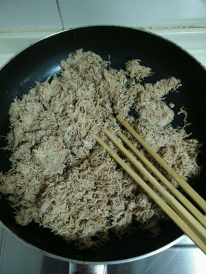 把搅拌好的肉松放到不粘锅里,用中火开始炒制,用几根筷子代替铲子在锅里翻拌。