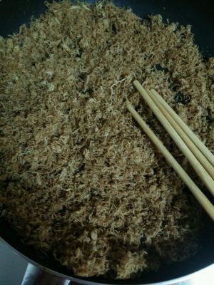 一直炒到水份收干,尝尝很脆、很酥松就可以关火了。炒制好的肉松用手一捏就可以捏成粉了,好酥松呀!