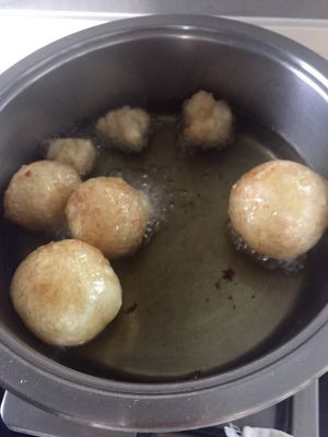 炒锅加热均匀,加入油250克,油中等热后,把面筋揪小块往锅内。等膨胀大后,再炸1分钟捞出放入盛有纯水的容器内泡一下去油捞出挤干