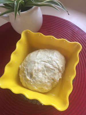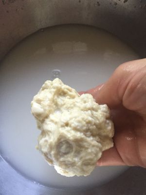 取出所有絮状物和成一团,加点酵母手工揉个几秒,放置一下,过段时间用清水冲洗一遍,挤干。