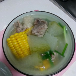 排骨煮了大约一小时后放入玉米和冬瓜,继续炖