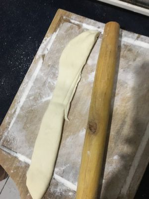 将醒好的面分成3份,搓成长条。