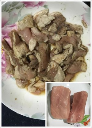 准备一块新鲜的瘦肉,切片洗净后,加入酱油、黑椒、盐腌制15分钟。