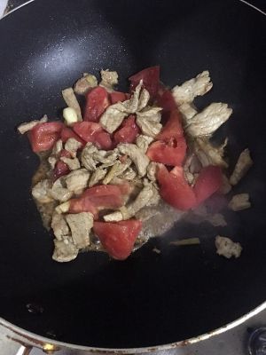 热锅倒入少许油,放入腌制好的肉片翻炒至肉片变色,反超过程中可导入少许料酒,然后将西红柿也一并倒入翻炒至西红柿软烂出汤汁。