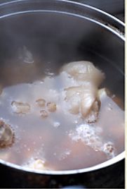 在锅中倒入沸水加入猪蹄,葱姜蒜片,炖煮30分钟。