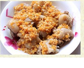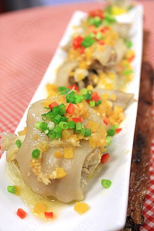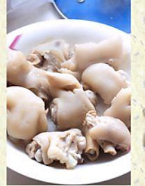 飞水的猪蹄码放在盘中,上面均匀涂抹黄椒酱。