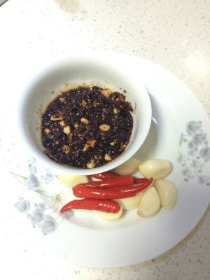辣椒,蒜,姜,切末;花生仁干炒至外皮可剥离,芝麻仁也用锅烘烤出香味,备用