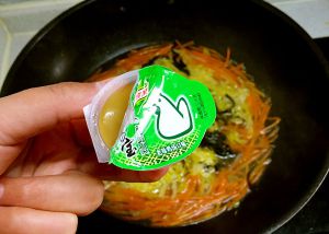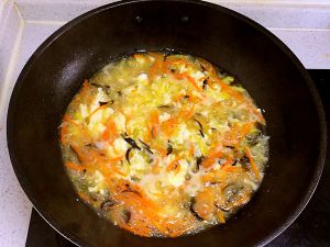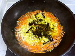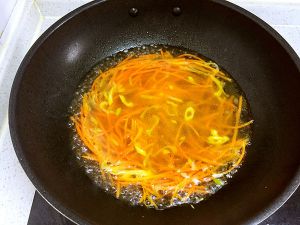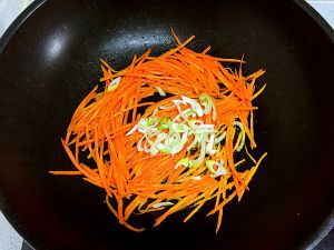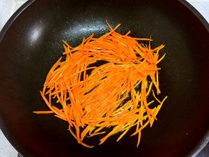 炒锅热油,倒入胡萝卜丝煸炒出红油