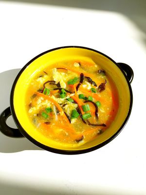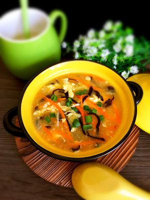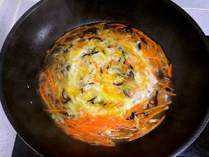 用淀粉水勾芡,倒入蛋液,形成蛋花