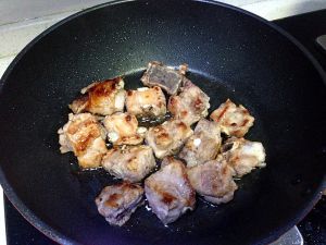 待油烧热后,排骨入锅煎炸至微微金黄