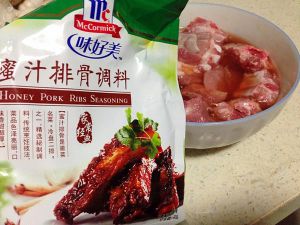 排骨洗净后,加入适量盐、料酒和蜜汁排骨粉,腌渍一会儿