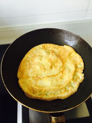 将打散的鸡蛋放入平底锅中,煎成蛋饼