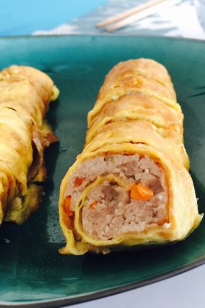 在煎好的鸡蛋饼上铺上一层肉馅,不要太薄、也不要太厚,适中,然后像卷寿司一样卷起来