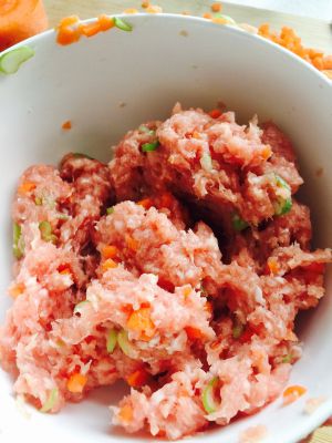 将切好的胡萝卜和葱放入肉馅里,加入淀粉、鸡精、十三香、少许盐,放一个蛋清,顺时针搅拌,肉馅粘在一起就可以了