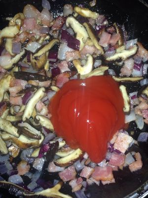煸炒3分钟后加入番茄沙司(记住是沙司!)大概占全锅的40%不要不舍得