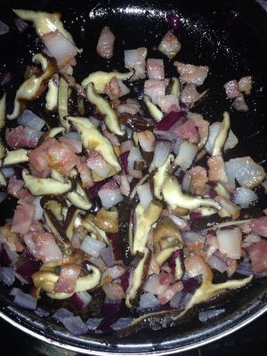 再放入香菇和培根,待培根变色,加入黑胡椒。