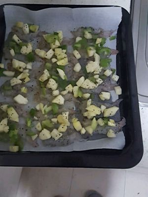把腌好的虾摆好,苹果柿子椒摆虾上,可以适当添加黑胡椒。