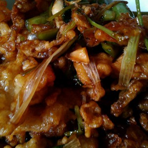锅加底油,炒配料出香味,加生抽调好的料。炒匀。加入刚炸透的肉片