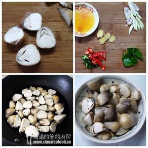 大虾去壳(不去也可以)、草菇洗净去掉根蒂,对半切开。