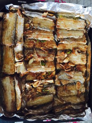 教程送你们:带鱼切段洗净备用,准备一个大碗,放入盐(少量),糖,醋,酱油(少量),十三香,蚝油,葱姜蒜切片放入,搅拌均匀,放入带鱼腌渍20分钟,烤箱预热,带鱼码放进烤盘,烤盘需铺锡纸,锡纸刷薄油,带鱼码放好后,将碗底所剩调料加入,在带鱼表面刷油,上下管200度,大约25分钟~