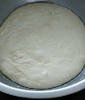 天冷,我将面盆隔水放在热水锅中,1小时即发好。发至2倍大,拨开呈蜂窝状。为防止面团表皮发干,可抹一层油,盖上盖子。