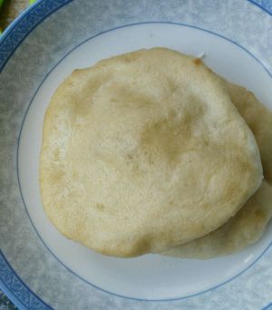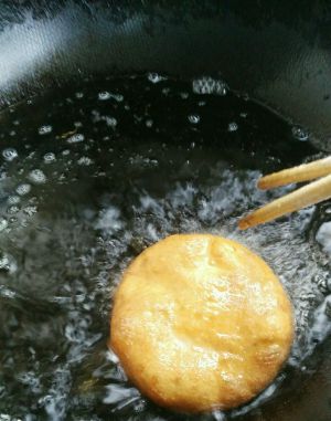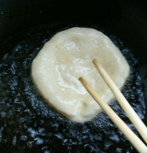 锅中放油加热,冒烟关小火,将饼胚放入锅内,用筷子轻敲其发面,膨起时快速翻面。