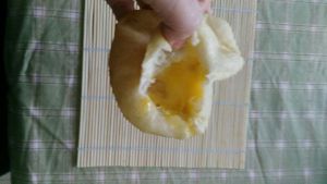 在饼胚上划个口,将打好的鸡蛋倒进去,封口。中小火炸,火大鸡蛋夹生,表皮易糊。