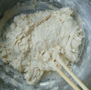 慢慢加温水用筷子搅拌成稠糊,和成软软的面团。越软越好。