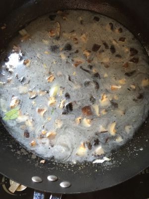 倒入香菇,放入适量盐、胡椒粉,转大火