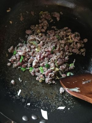 加热少许油,倒入牛肉粒葱姜蒜炒香,加入料酒,待肉变色且闻到香味后加水