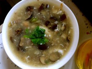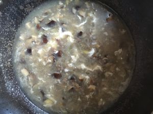牛肉和香菇煮熟后倒入提前备好的水淀粉,一边倒一边搅拌,接着倒入蛋清并搅拌成花状,关火,撒小半勺鸡精搅匀,最后撒上香菜即可。