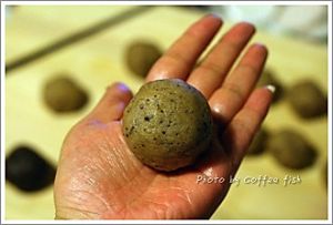 将已经冷藏的奶酪馅料平均分成10份.揉成小团.