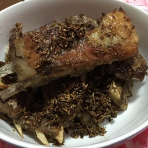 羊排煎成金黄色即可出锅。锅里煎熟的孜然粒可不要浪费了呀,和羊排一起装盘,喜欢吃辣的盆有还可以撒点儿辣椒面,香香哒。